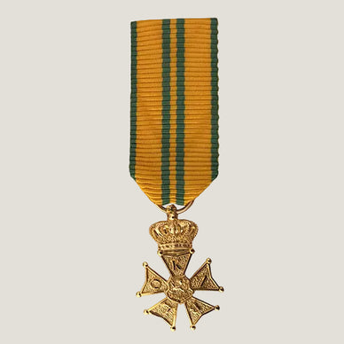 Miniatyrmedaljen monteras för hand i Medaljmästers ateljé med vattrat viskosband. Medaljen är tillverkad av pläterad mässing och följer svensk standard om 16 mm i diameter.